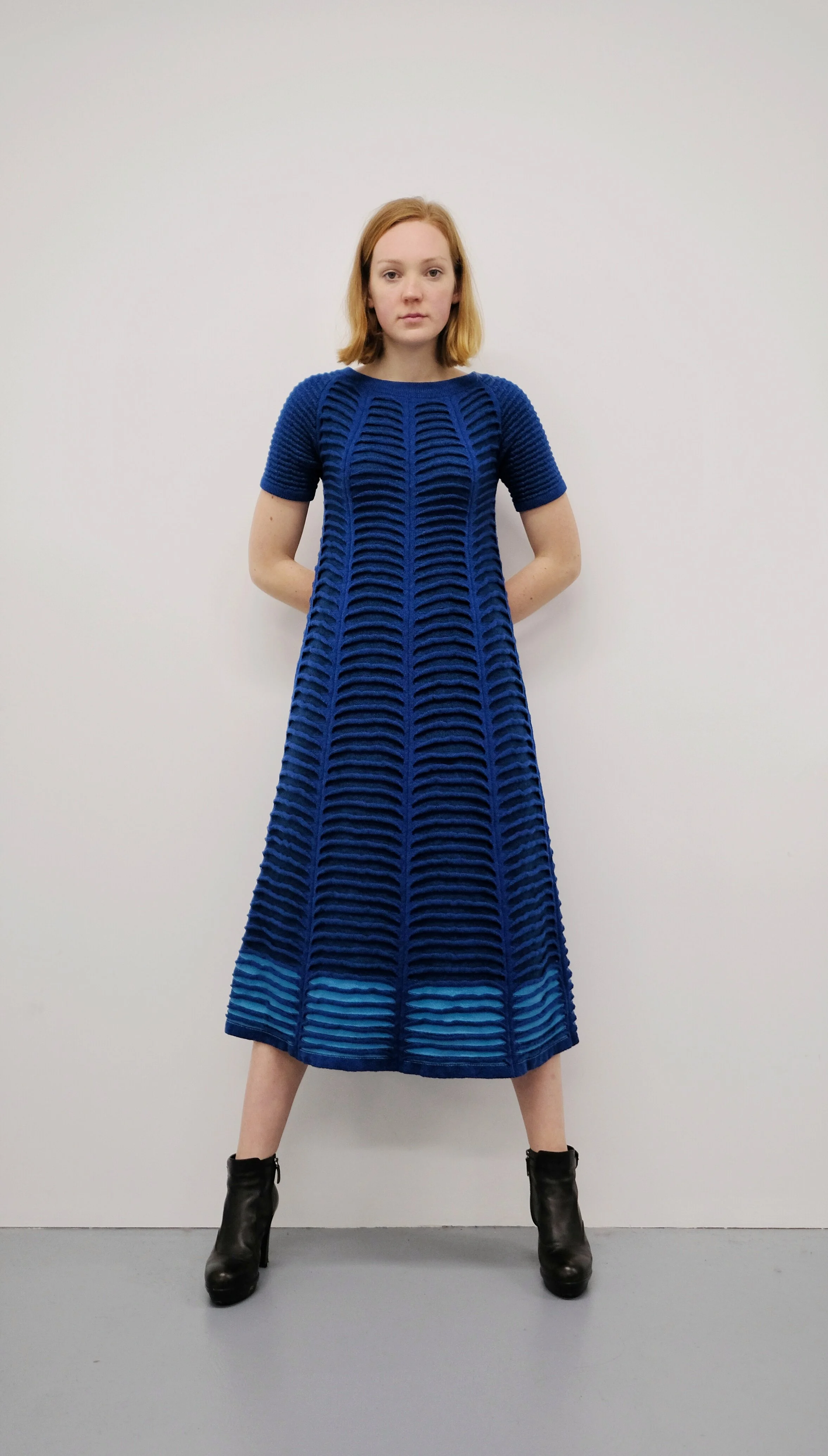 A-line raglan short sleeve dress with boat-neck, all-over classic ocean-wave pattern.