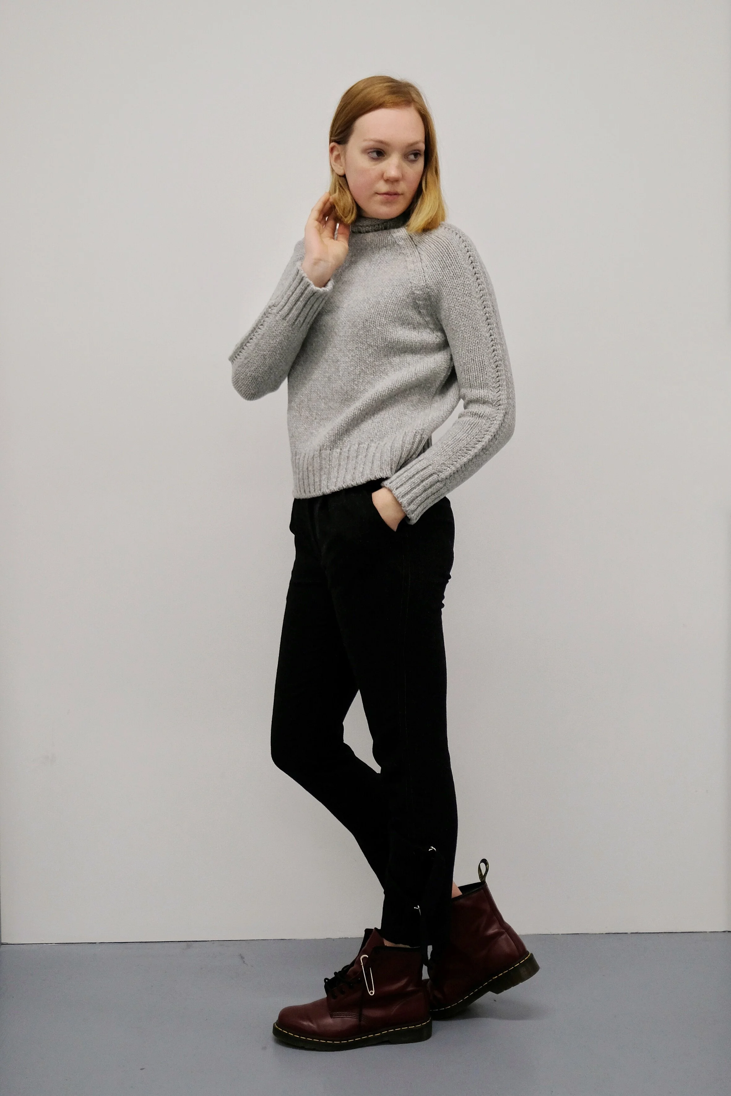 Raglan shaped sweater with centre-line detailing on sleeve, round neck with roll detailing.